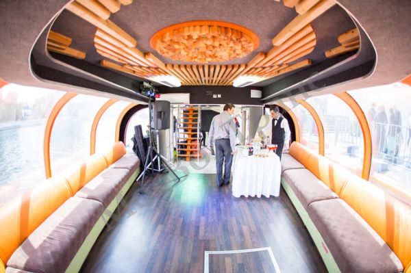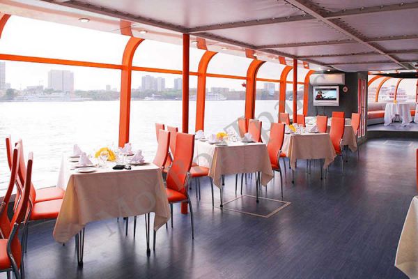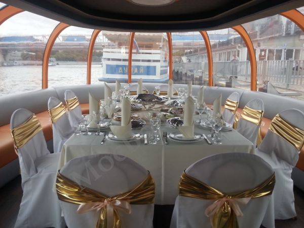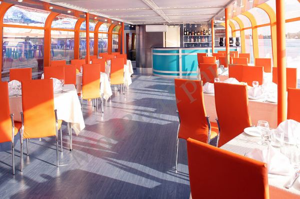 Преимущества теплохода Император: возможность проведения мероприятий с большим числом приглашённых, панорамное остекление, большой выбор круизных маршрутов, стильный ресторан на 70/100 гостей.