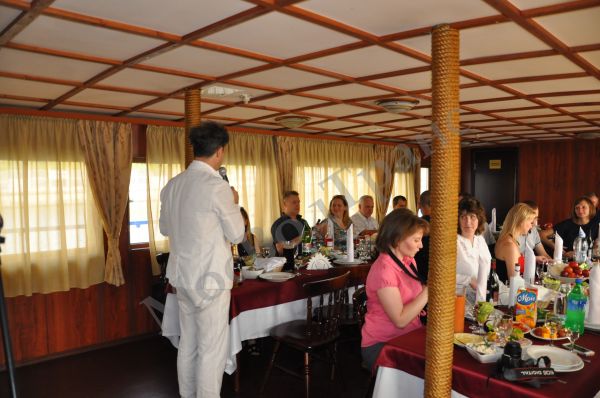 Описание: Иван Купала это теплоход проекта «озерно-морской», его центральная палуба разделена на два зала. Банкетный зал вмещает около сорока человек, его дизайн радует глаз свежей отделкой и яркими теплыми тонами. Так же на теплоходе Иван Купала есть комфортабельный носовой салон с мягкой мебелью привлекательной расцветки, панорамным остеклением, барной стойкой и живыми цветами. Это помещение отлично подойдет, чтобы уединиться там для деловых переговоров или попеть караоке. Большим преимуществом является верхняя палуба этого корабля – она так же разделена на две части: нижняя часть накрыта тентом, надежно защищающим от непогоды, и располагает комфортабельной мебелью, ну а верхняя полностью открыта, что позволяет устраивать активные конкурсы во время корпоратива или дискотеку под открытым небом.